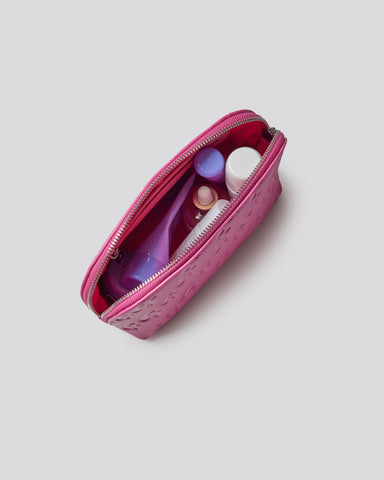 Get glam on-the-go with our Monogram Cosmetic Pouch in hot pink vegan leather. Perfect for storing skincare, makeup, and small essentials.