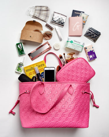 Carry luxury with you wherever you go with our MONOGRAM GLAM TOTE MIRROR HOT PINK. Vegan leather, signature logo, and versatile design for the modern woman.