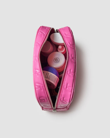 Organize your cosmetics in style with this monogrammed toiletry bag in hot pink. Perfect for travel, with a convenient interior pocket.