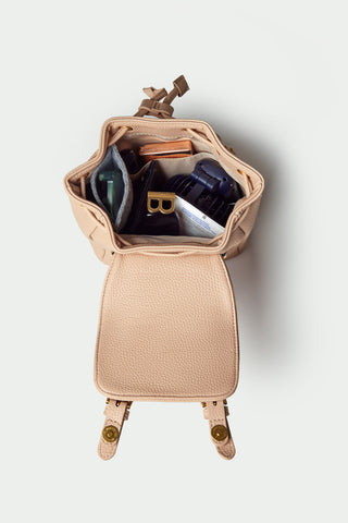 Pretty meets practicality in this backpack made of richly-textured vegan pebble leather. Gold buckles accent its drawstring closure, opening into an interior with a zip pocket. A sizable exterior pocket holds essentials, while a removable strap allows for crossbody or shoulder-slung wear. Consider carrying it by its top handle to show off every feature.